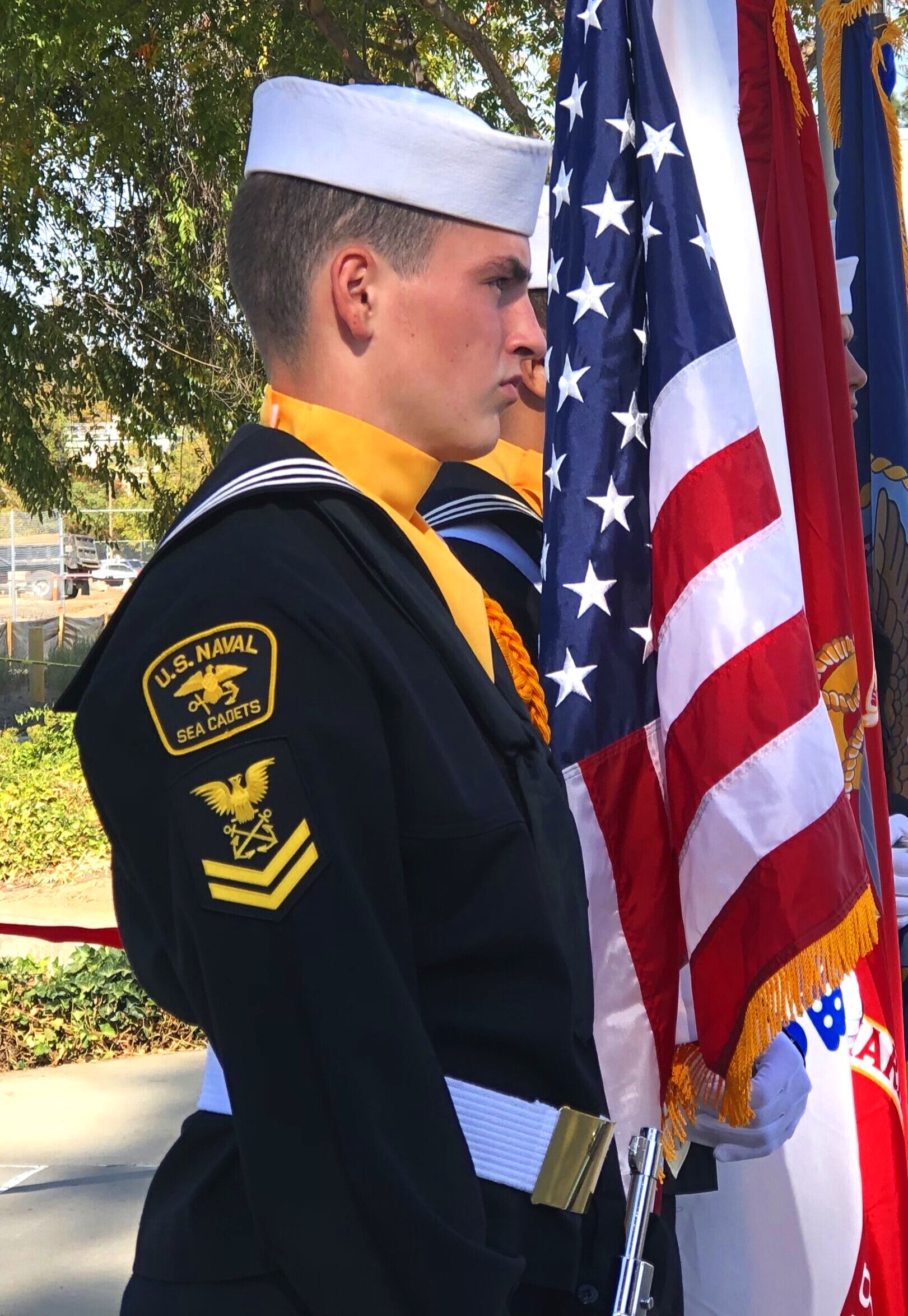 . As Cadets advance through the ranks of the Sea Cadets they will earn rank patches that must be sewen on dress blues and dress whites. This is the dress blue uniform pictured in figure 4 adapted for field use. For shore patrol the trouser bottoms are now tucked inside canvas leggings for.